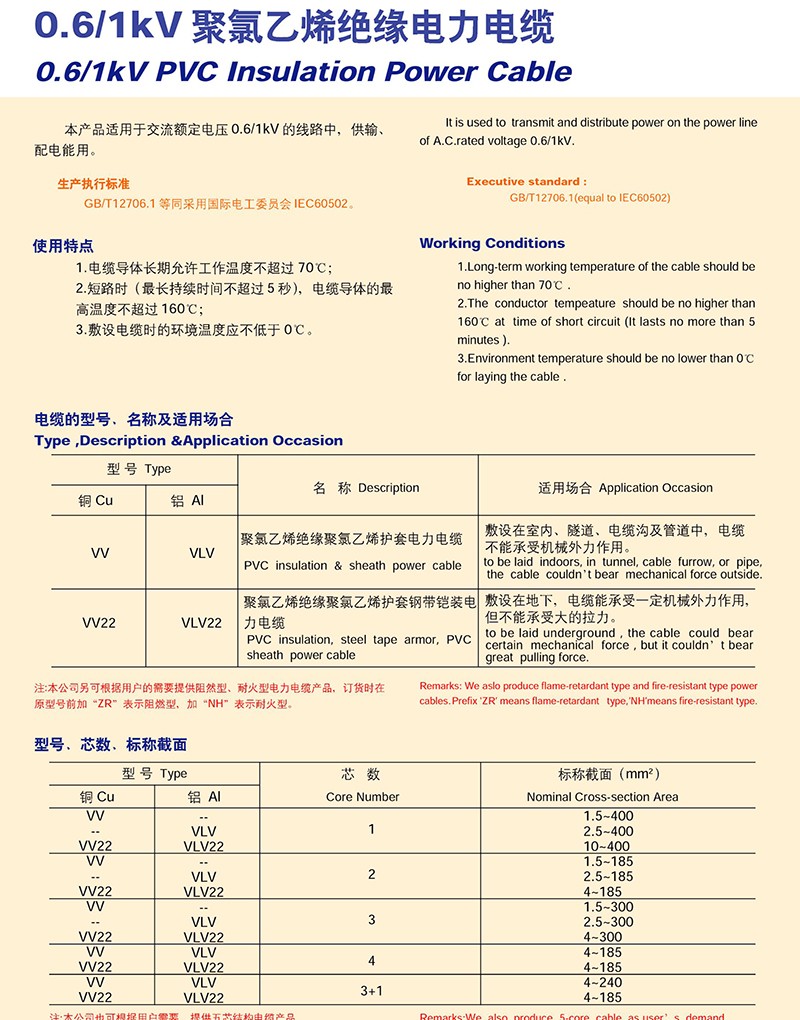 0.6/1KV聚氯乙烯絕緣電力電纜的產(chǎn)品詳細(xì)介紹: